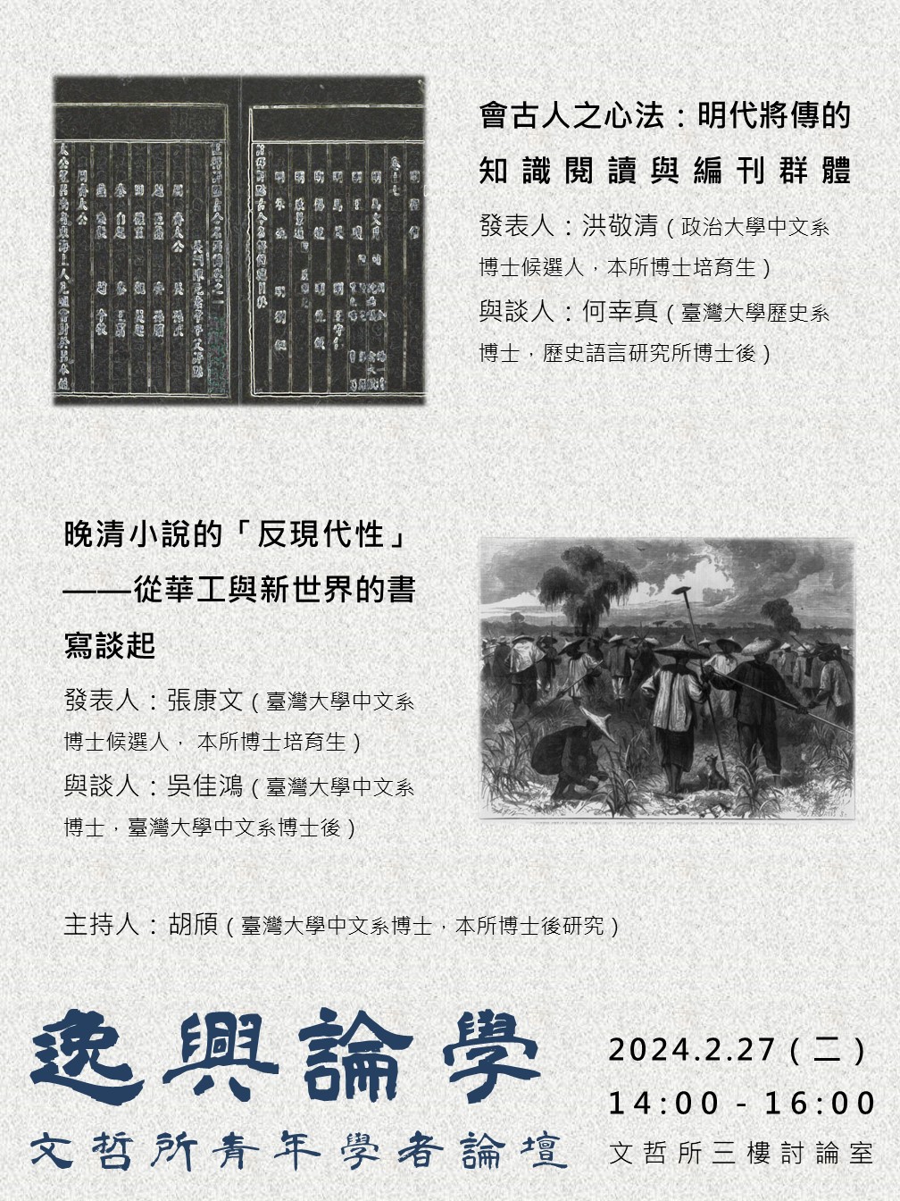 第一場 會古人之心法:明代將傳的知識閱讀與編刊群體 發表人:洪敬清(政治大學中文系博士候選人,本所博士培育生) 與談人:何幸真(臺灣大學歷史系博士,歷史語言研究所博士後) 第二場 晚清小說的「反現代性」——從華工與新世界的書寫談起 發表人:張康文(臺灣大學中文系博士候選人, 本所博士培育生) 與談人:吳佳鴻(臺灣大學中文系博士,臺灣大學中文系博士後) 主持人:胡頎(臺灣大學中文系博士,本所博士後研究) 檔案下載