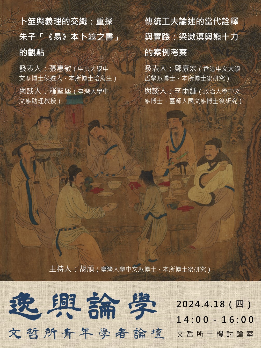 第一場 卜筮與義理的交織:重探朱子「《易》本卜筮之書」的觀點 發表人:張惠敏(中央大學中文系博士候選人,本所博士培育生) 與談人:羅聖堡(臺灣大學中文系助理教授) 第二場 傳統工夫論述的當代詮釋與實踐:梁漱溟與熊十力的案例考察 發表人:鄧康宏(香港中文大學哲學系博士,本所博士後研究) 與談人:李雨鍾(政治大學中文系博士,臺師大國文學系博士後研究) 主持人:胡頎(臺灣大學中文系博士,本所博士後研究) 檔案下載