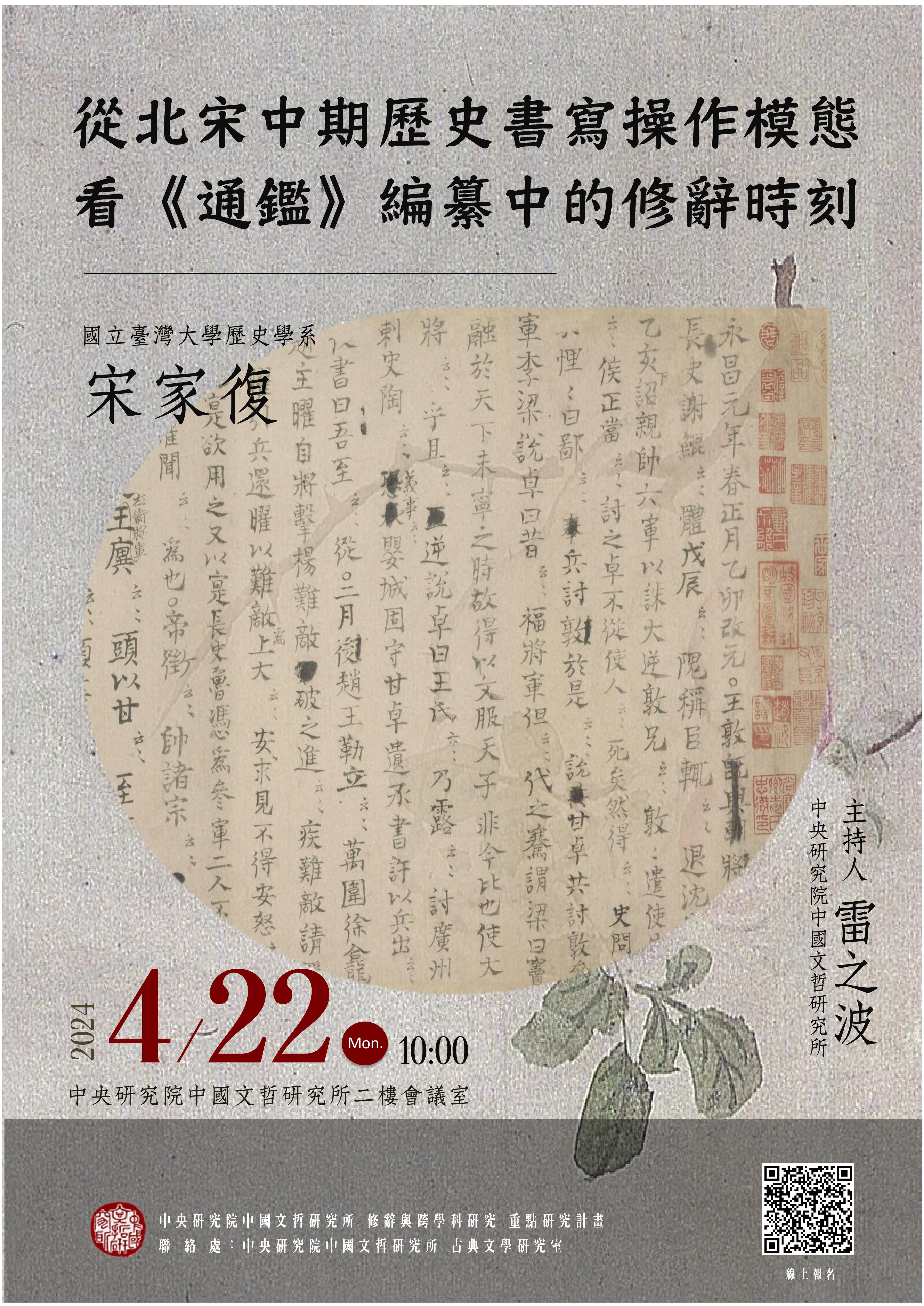 講 者:宋家復教授(國立臺灣大學歷史學系副教授) 主持人:Zeb Raft 雷之波教授(本所副研究員) 本活動採實體與視訊方式並行。 ※報名截止時間:4/17(三)中午12:00。 ※主辦單位將於 4/18(四)17:00之前 以電子郵件通知。 ※主辦單位保留審核報名的權利。 ※配合政府環保規定,本所不提供紙杯,請自備環保杯。 ※本活動所蒐集之個人資訊,將僅限使用於此次活動,並遵守法律規定,保障您的個人資訊安全。您亦享有法律規定之相關個人資訊權利。 檔案下載