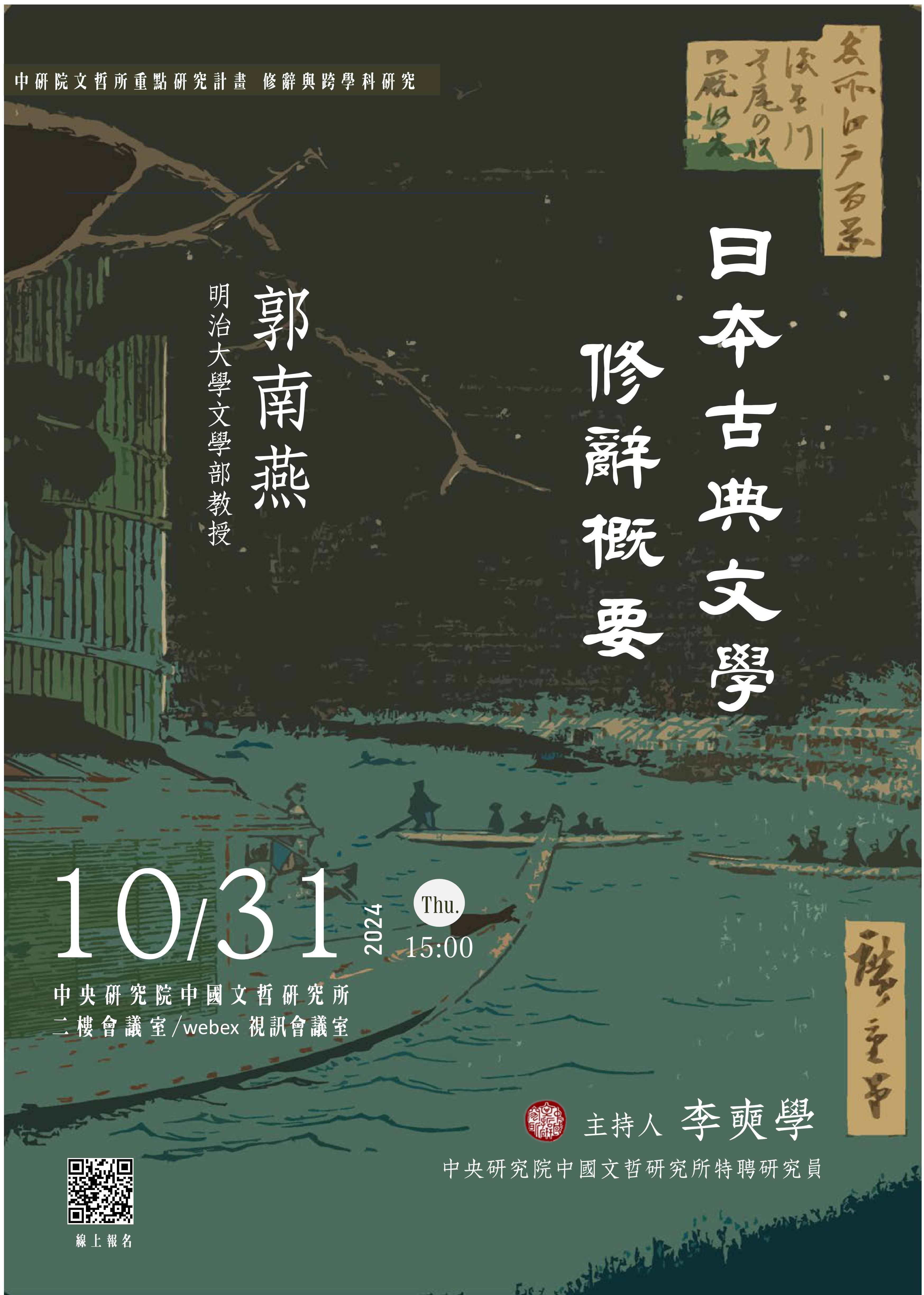 講 者:郭南燕教授(日本明治大學文學部教授) 主持人:李奭學教授(中央研究院中國文哲研究所特聘研究員) 本活動採實體與視訊方式並行。 ※報名截止時間:10/28(一)中午12:00。 ※主辦單位將於 10/29(二)17:00之前 以電子郵件通知。 ※主辦單位保留審核報名的權利。 ※配合政府環保規定,本所不提供紙杯,請自備環保杯。 ※本活動所蒐集之個人資訊,將僅限使用於此次活動,並遵守法律規定,保障您的個人資訊安全。您亦享有法律規定之相關個人資訊權利。 檔案下載