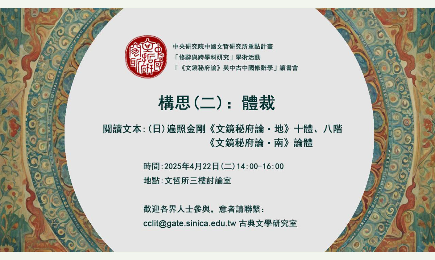 「《文鏡秘府論》與中古中國修辭學」第三次讀書會 主題:構思(二):體裁 閱讀文本:〔日〕遍照金剛《文鏡秘府論‧地卷》十體、八階 /《文鏡秘府論‧南卷》論體 歡迎各界人士參與,意者請聯繫: cclit@gate.sinica.edu.tw 古典文學研究室 中央研究院中國文哲研究所重點研究計畫:修辭與跨學科研究(https://sites.google.com/view/rhetoric2024-2026/) 檔案下載