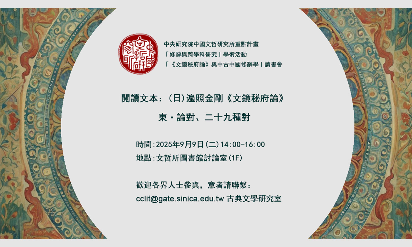 「《文鏡秘府論》與中古中國修辭學」第六次讀書會 閱讀文本:〔日〕遍照金剛《文鏡秘府論》「東卷‧論對、二十九種對」 歡迎各界人士參與,意者請聯繫:古典文學研究室cclit@gate.sinica.edu.tw 中央研究院中國文哲研究所重點研究計畫:修辭與跨學科研究 檔案下載