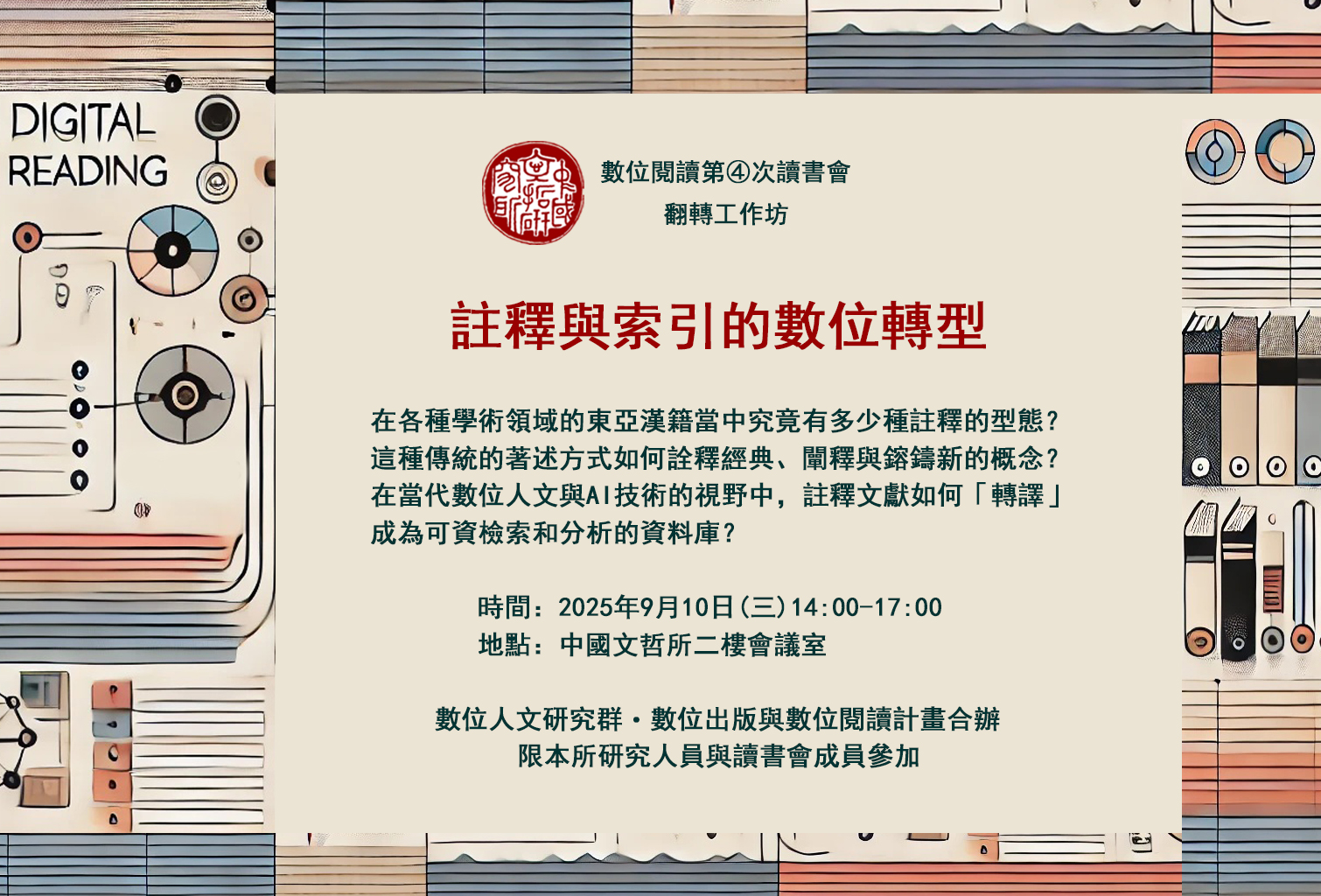 在各種學術領域的東亞漢籍當中究竟有多少種註釋的型態? 這種傳統的著述方式如何詮釋經典、闡釋與鎔鑄新的概念? 在當代數位人文與AI技術的視野中,註釋文獻如何「轉譯」 成為可資檢索和分析的資料庫? 數位人文研究群.數位出版與數位閱讀計畫合辦 本次工作坊僅限本所研究人員.讀書會成員.邀請學者參加 有興趣者請聯繫:羅珮瑄 winnie72@gmail.com <mailto:winnie72@gmail.com> 檔案下載 Agenda