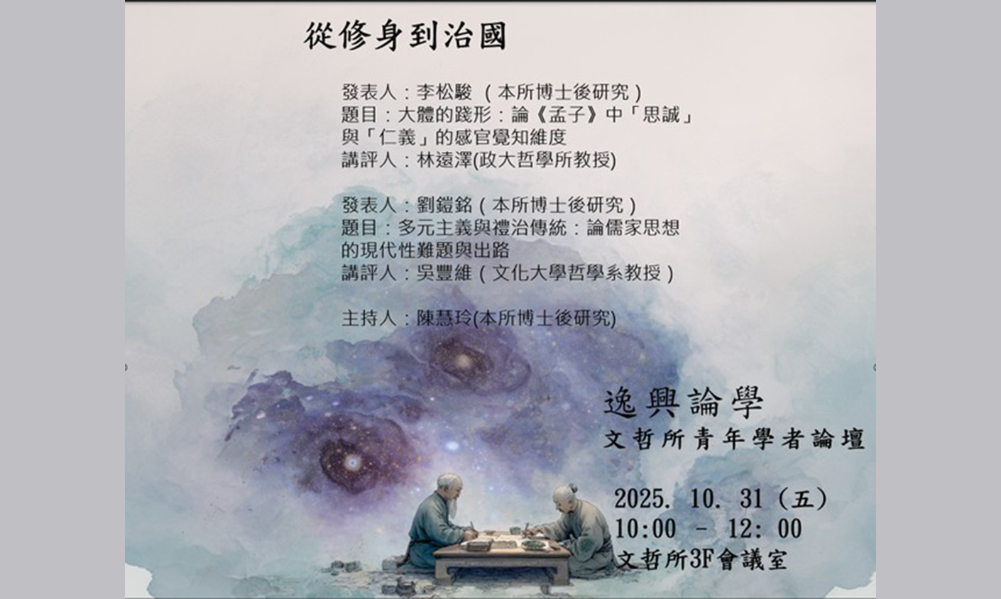 發表人:李松駿 (本所博士後研究) 題目:大體的踐形:論《孟子》中「思誠」與「仁義」的感官覺知維度 講評人:林遠澤(政大哲學所教授) 發表人:劉鎧銘(本所博士後研究) 題目:多元主義與禮治傳統:論儒家思想的現代性難題與出路 講評人:吳豐維(文化大學哲學系教授) 主持人:陳慧玲(本所博士後研究) 檔案下載