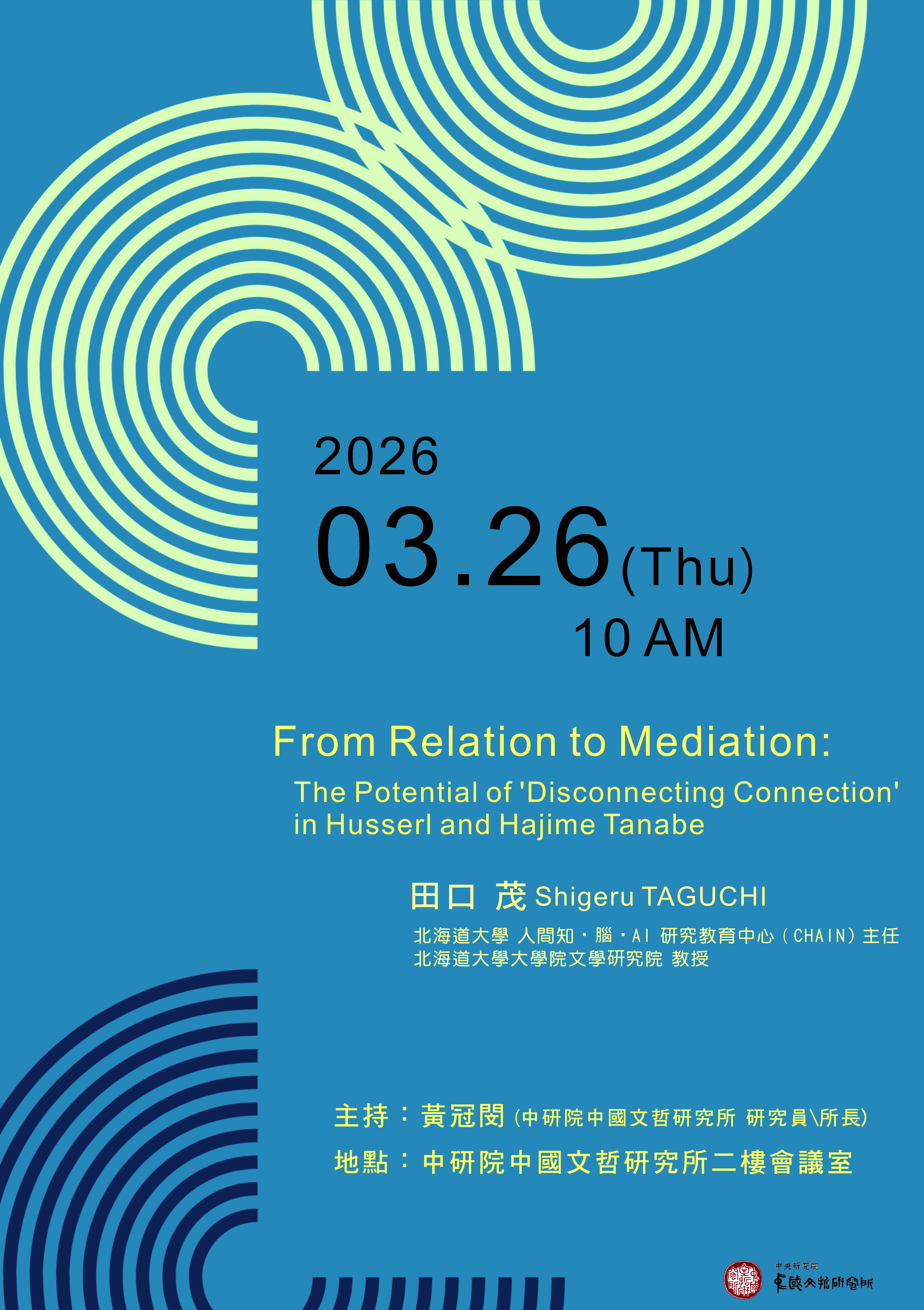 講者:田口 茂 Shigeru TAGUCHI (日本北海道大學人類智慧、腦與AI研究教育中心(CHAIN)主任 / 日本北海道大學文學研究科教授) 主持:黃冠閔 (中央研究院中國文哲研究所研究員/所長) 檔案下載